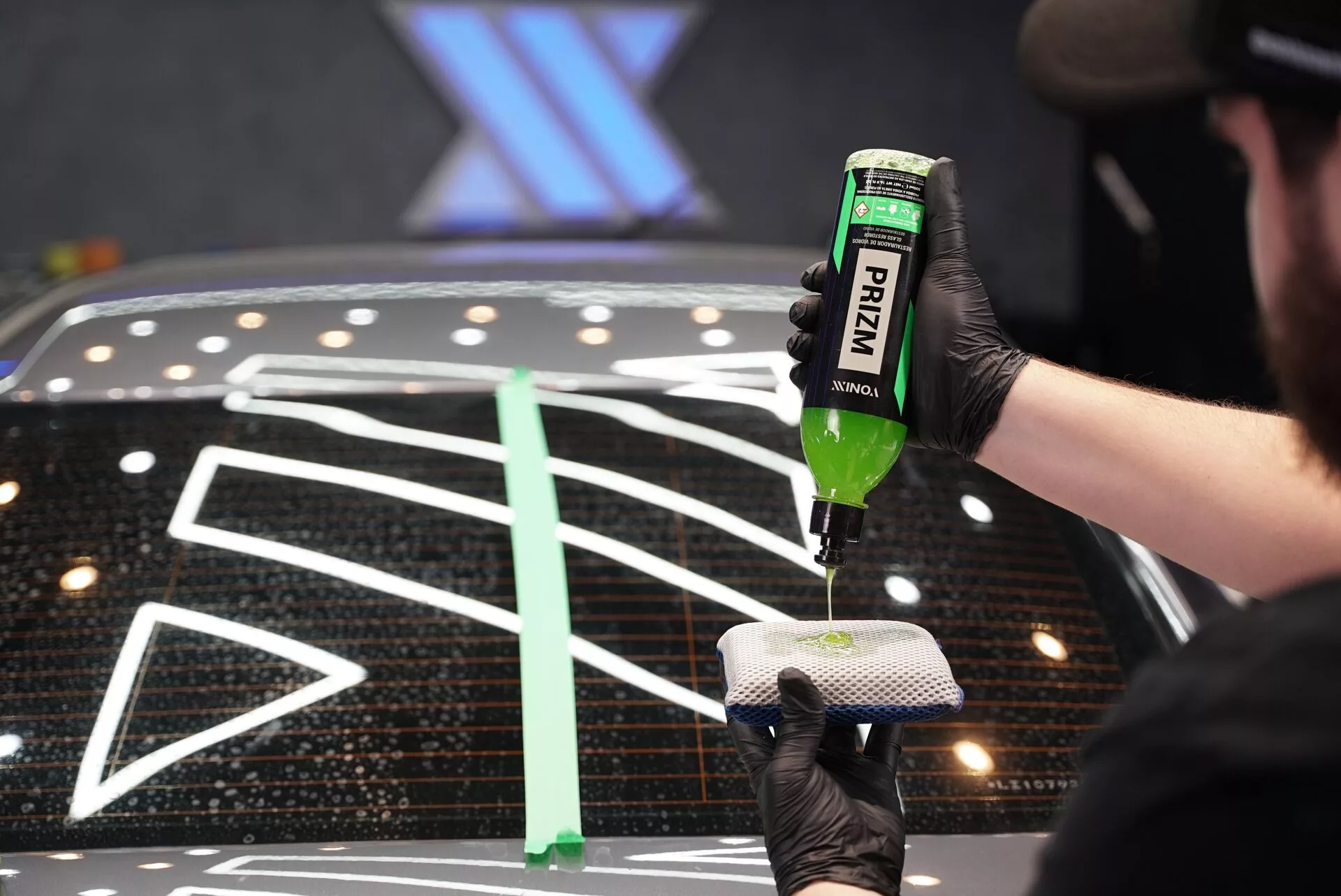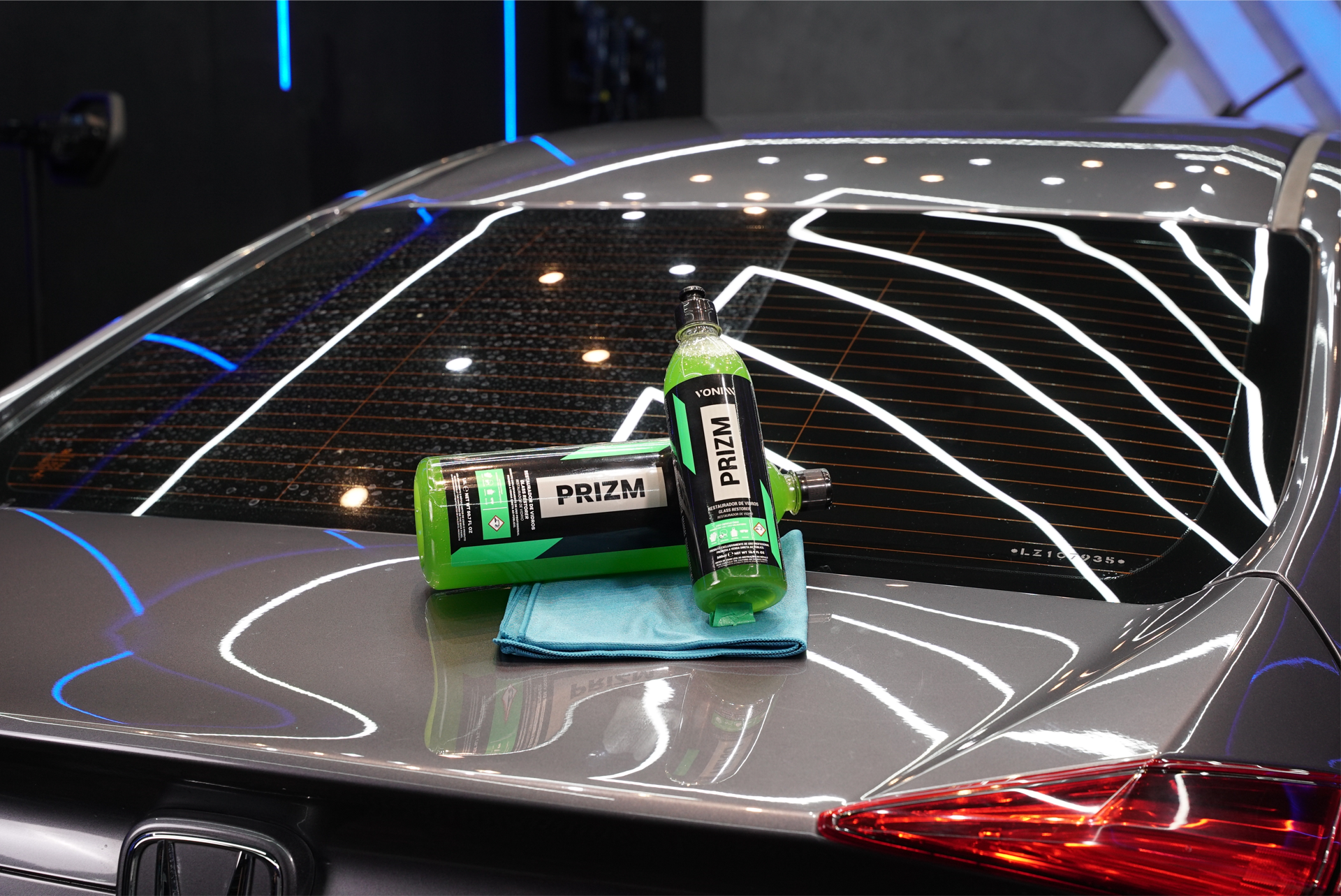 Prizm obnovuje průhlednost automobilového skla a odstraňuje zanořené vodní stopy, nečistoty a kontaminanty, které nelze odstranit běžným čištěním.